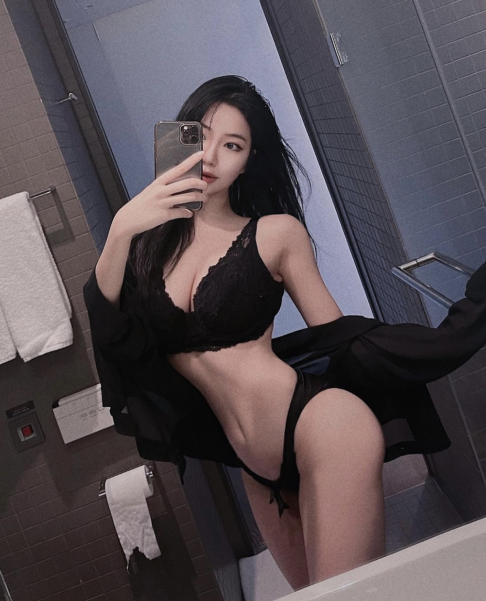 로예베 욕실에서 검은 브라팬티 입고 셀카