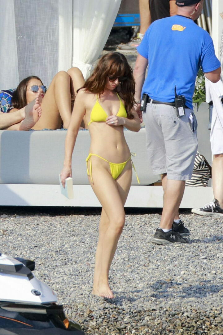 노란 비키니 입은 다코타 존슨