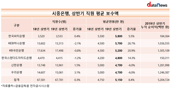 시중은행, 2019 상반기 직원 평균 연봉