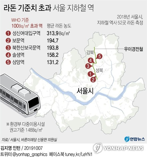라돈 기준치 초과 서울 지하철 역
