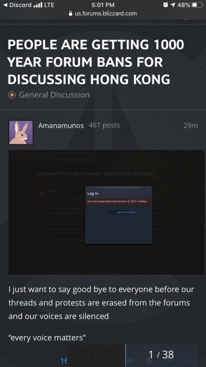 블리자드 포럼에서 홍콩에대해 이야기한 유저를 트롤링이라는 이유로 1000년 밴 당함