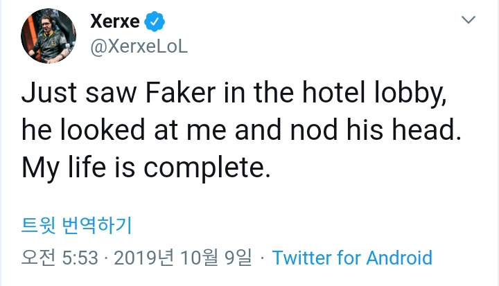 "방금 호텔 로비에서 페이커 봄. 그 분이 나를 보시고 고개를 끄덕이시니 내 인생은 완성되었다."