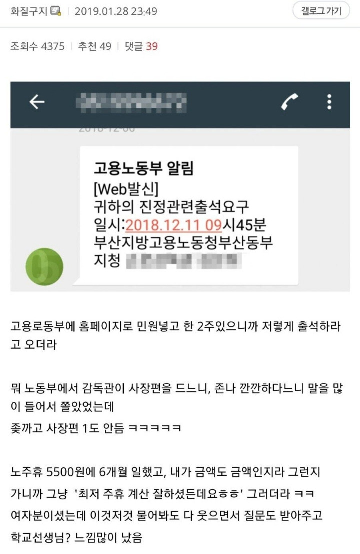 시급 5500원 체불 사장 신고 후기