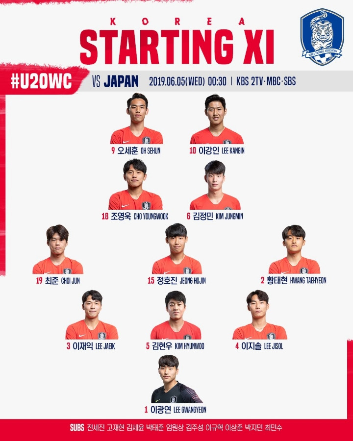 U-20 월드컵 16강 한일전 대한민국 라인업