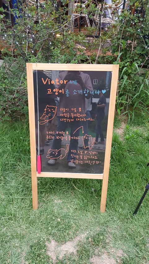 비아토르 사장님은 오랜 캣맘이며 신도림에서 식당을 하며 거둔 7마리의 고양이와 함께 경의선 숲길로 이사를 했습니다 신도림에서 식당을 하던 당시에는 주민들이 고양이를 좋아하지 않아서 몰래 돌보고 고양이들도 경계를 했으나 경의선 숲길에는 많은 분들이 고양이를 좋아해주셔서 아이들도 사람의 손을 타기 시작했습니다