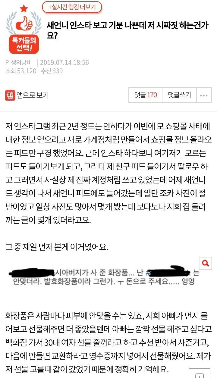새언니 인스타 보고 기분 나쁜데 저 시짜짓 하는건가요?