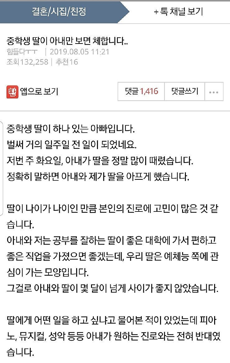 중학생 딸이 아내만 보면 체합니다