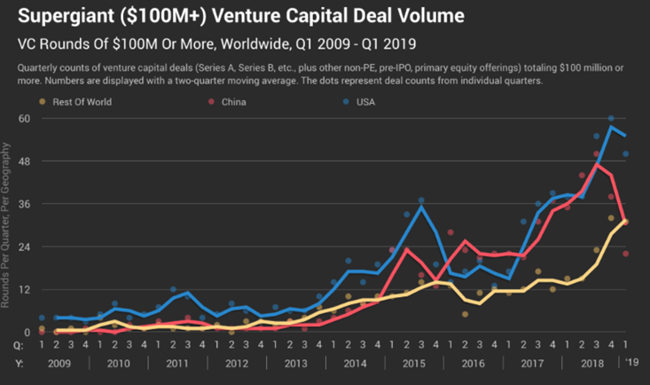 전년 대비 투자 규모는 무려 77%나 폭락하여 이번 2분기에는 94억 달러로 떨어졌다, 거래 성사건은 약 50%, 즉 절반 가량 하락한 692건으로 줄어들었다. 2018년 2분기 스타트업 관련 투자 규모는 413억 달러에 달했다. 이는 인터넷 결제업계의 거대 기업인 앤트 파이낸셜에 140억 달러가 흘러 들어가고, 인터넷 상거래 스타트업인 핀둬둬에 30억 달러가 유입되었고, 트럭 공유 서비스 업체인 만방 그룹(혹은 완전 트럭 연맹 그룹)에 19억 달러가 투자되었다. 이와 비교해 2019년 2분기에 성사된 가장 큰 벤처 자금 조달 규모는 고작 징둥 헬스(인터넷 상거래사인 징둥닷컴의 건강 관리 제휴)에 10억 달러가 투자된 정도에 불과했다.