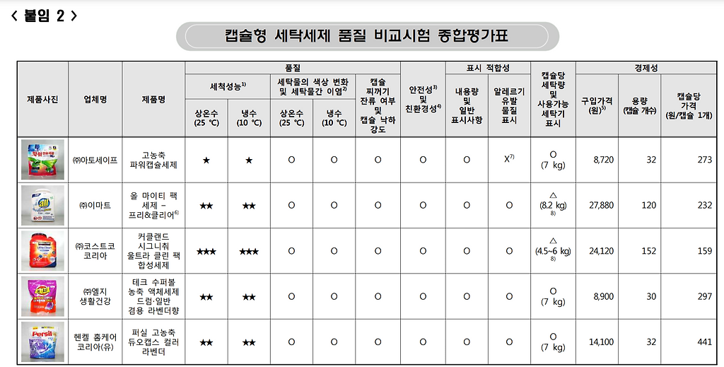캡슐형 세탁세제 품질 비교시험 종합평가표