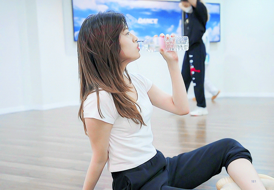 땀 흘린 후 성수 보충하는 안유진 ㅗㅜㅑ