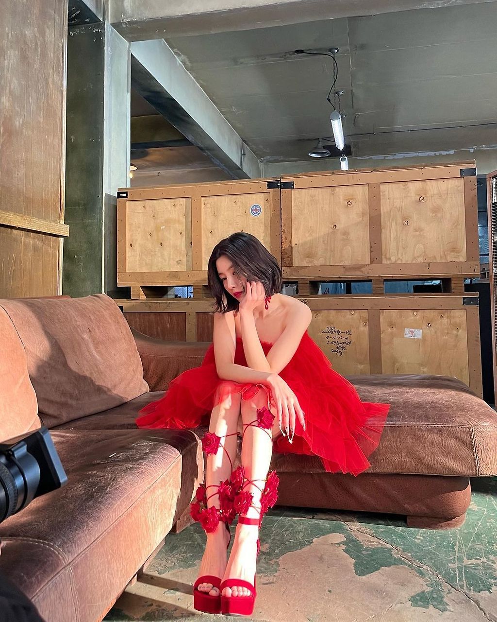 정열의 빨간드레스 입고 촬영하는 권은비 인스타그램