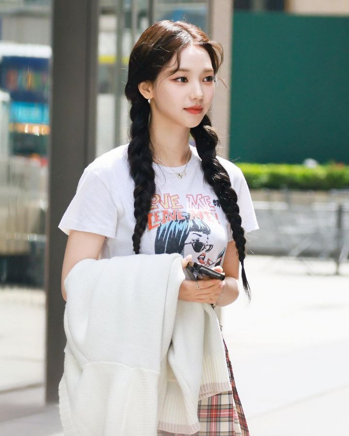 흰티에 양갈래 땋은 머리 카리나